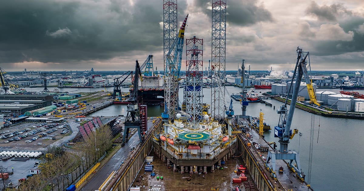 This occurred when Mammoet was contracted by shipbuilder and ship repair company Damen Shiprepair to assist with a jack-up leg repair for the Noble Corporation drilling rig Noble Regina Allen.