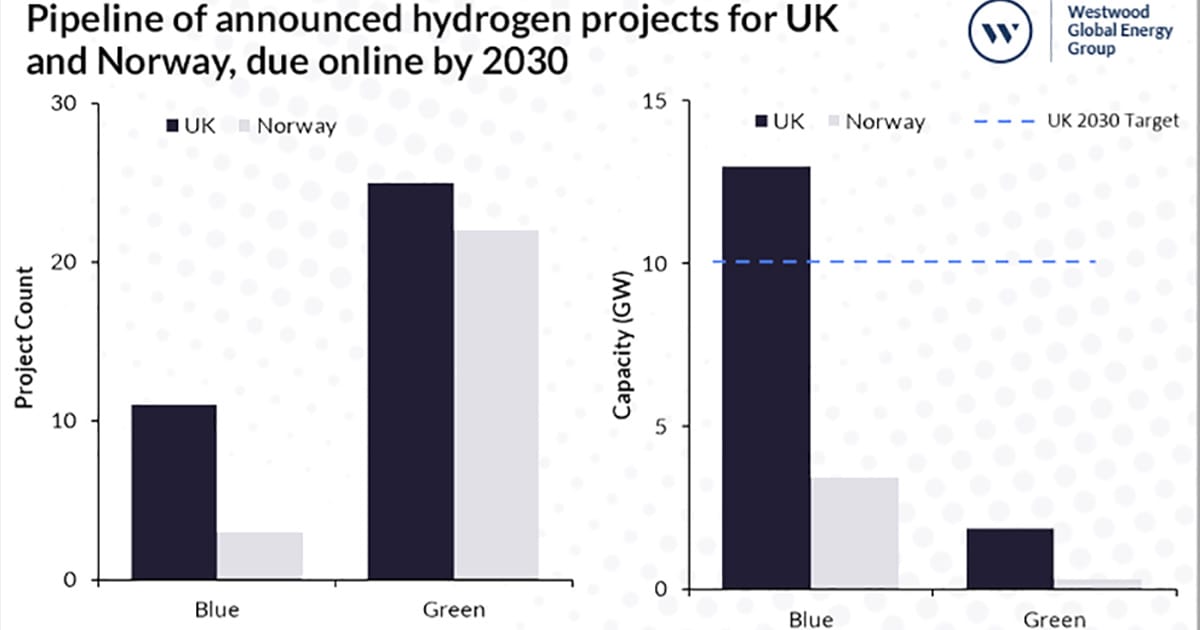 Latest analysis from Westwood Global Energy Group (Westwood), the specialist energy market research and consultancy firm, reveals that blue hydrogen projects account for over 16 GW of total announced hydrogen capacity in the UK and Norway, equivalent to approximately 90% of the hydrogen projects total for the same region. The UK alone accounts for 13 GW capacity.